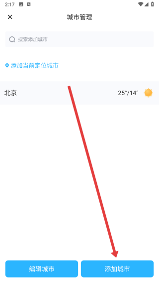 3、在進入到城市管理頁面中,可以找到添加城市按鈕,點擊進行添加操作。