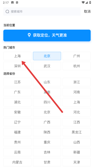 4、在進入到添加城市頁面,可以點擊上海按鈕進行添加該城市。