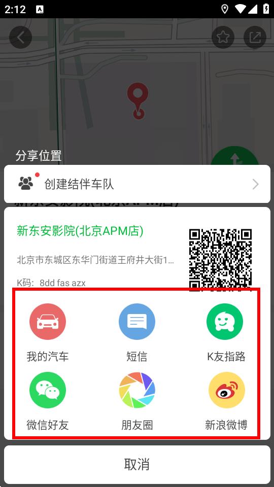 4、在彈出分享選項中,可選擇通過我的汽車、短信、K友指路、微信好友、朋友圈、新浪微博等方式分享路線信息。