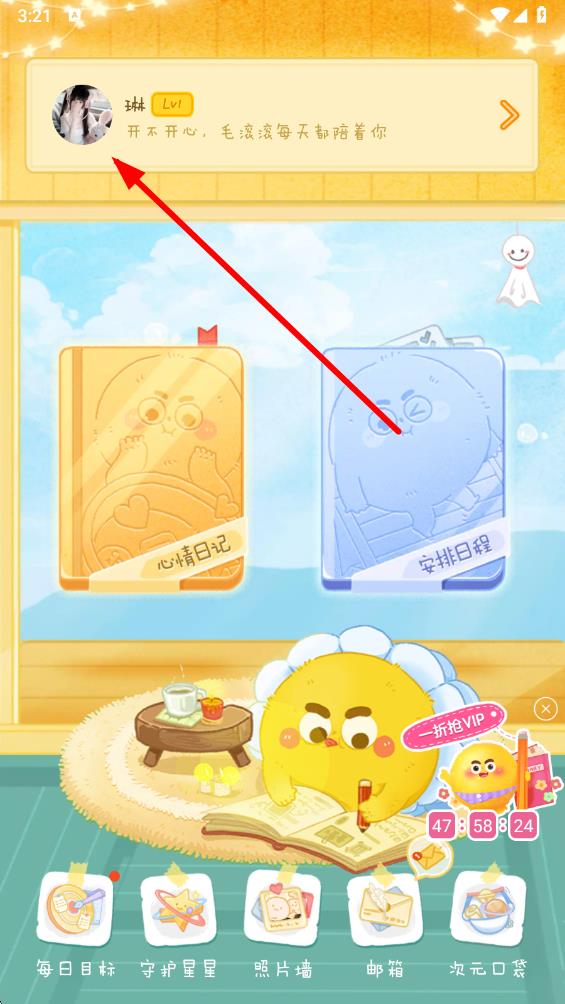 1、打開(kāi)毛滾滾日常app,點(diǎn)擊界面上方的頭像區(qū)域,進(jìn)入個(gè)人相關(guān)設(shè)置界面。