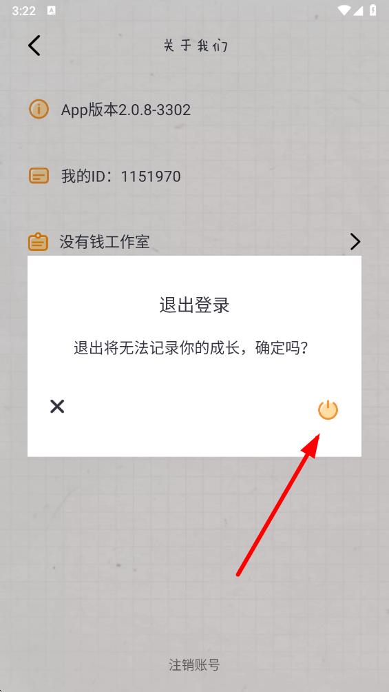 4、在退出登錄確認(rèn)提示框中,點(diǎn)擊帶有電源標(biāo)識(shí)的確認(rèn)按鈕,完成退出登錄操作。