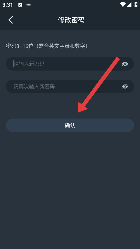 3、在新密碼設(shè)置頁面,輸入8-16位且含英文字母和數(shù)字的新密碼,再次輸入新密碼確認(rèn)后,點擊確認(rèn)按鈕完成密碼修改。