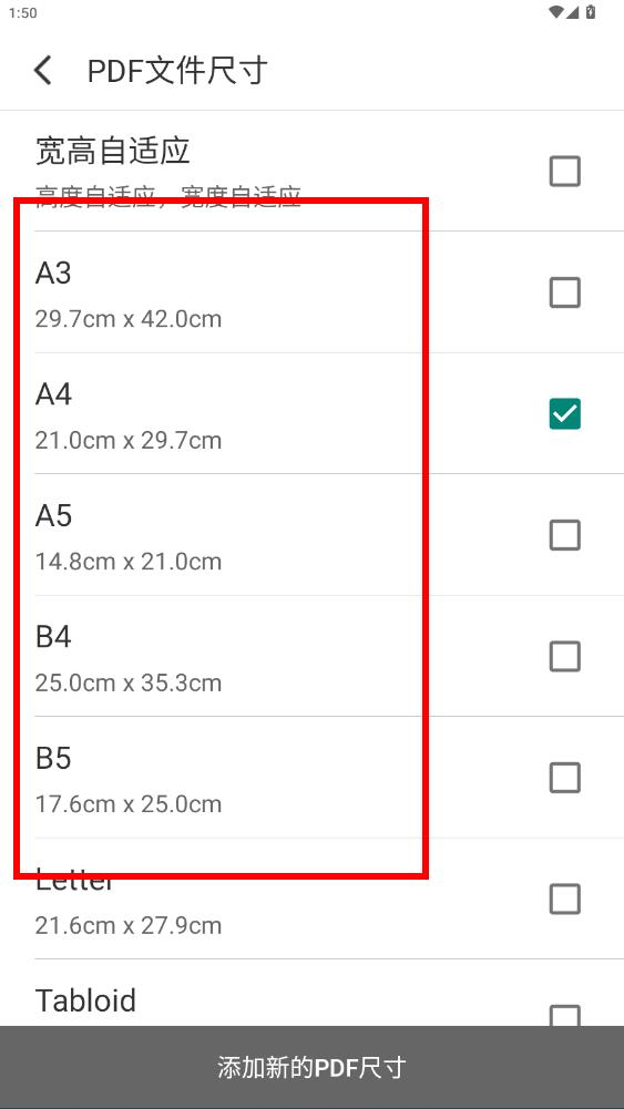 4、在PDF文件尺寸設置頁面,您可以看到多種尺寸選項,點擊您需要的頁面尺寸選項即可完成設置。