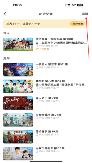 3、進(jìn)入歷史記錄的界面內(nèi),點(diǎn)擊右上角編輯的功能按鈕。