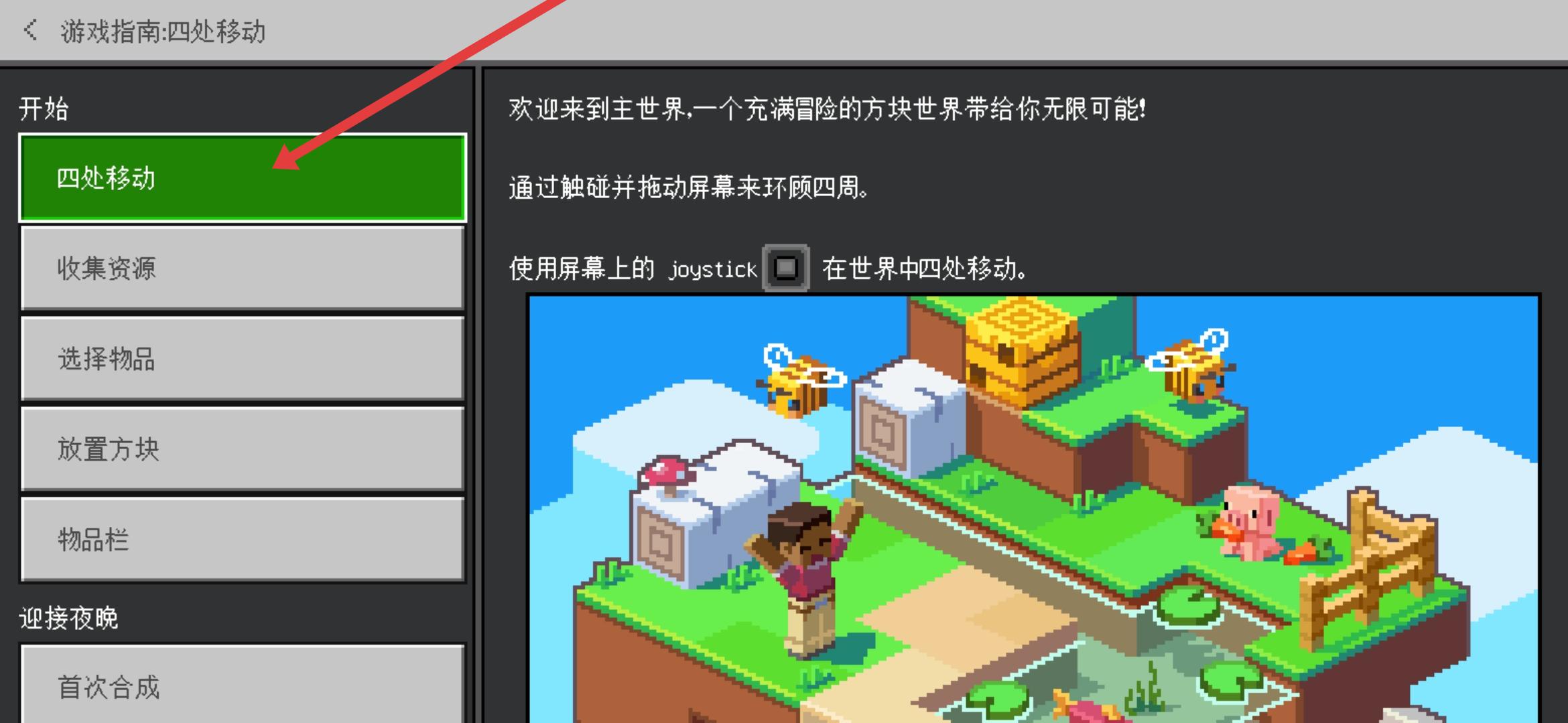 2、比如在游戲指南中選擇四處移動,學(xué)習(xí)通過觸碰拖動屏幕環(huán)顧、借助虛擬搖桿在世界中移動的操作。