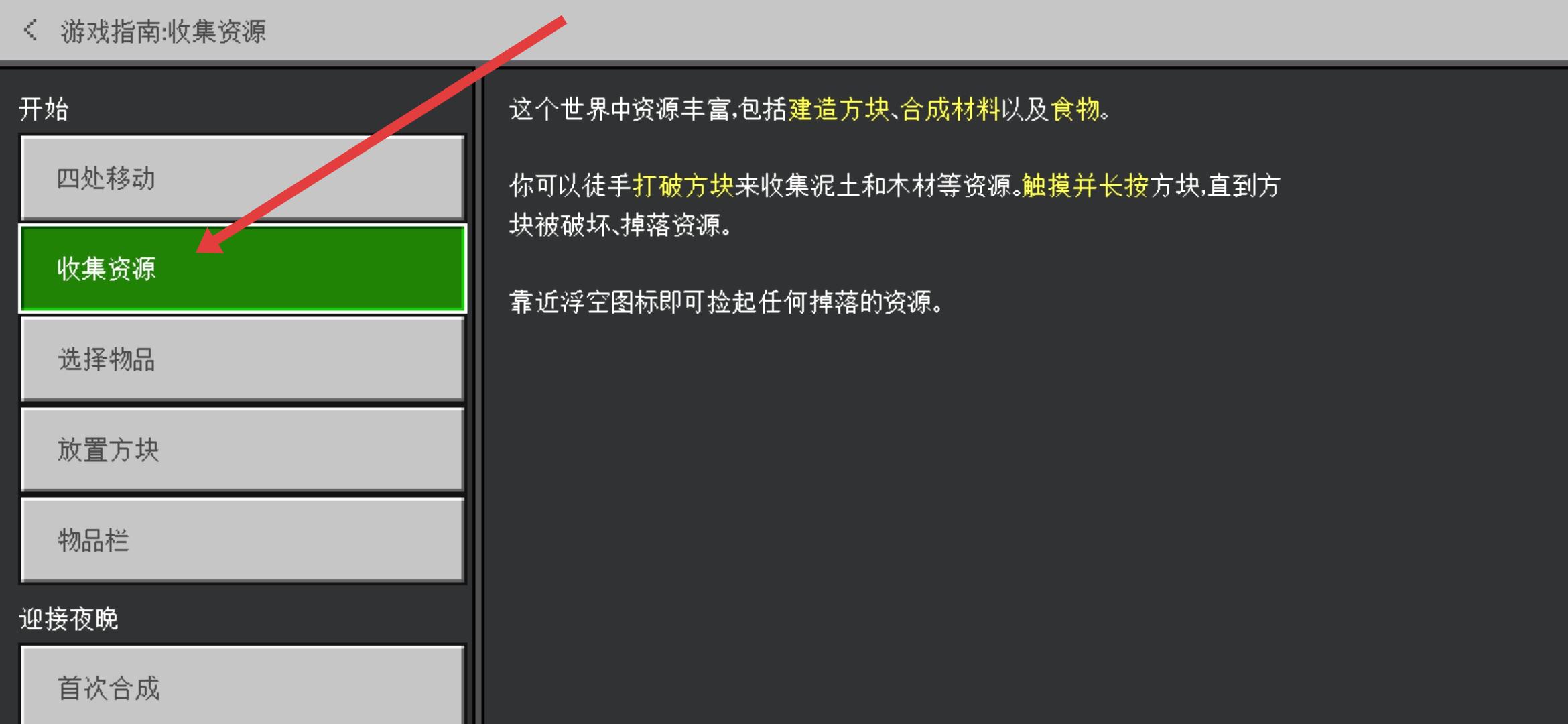 3、點擊游戲指南里的收集資源,了解徒手長按方塊破壞獲取資源,以及靠近掉落圖標(biāo)拾取的方法。