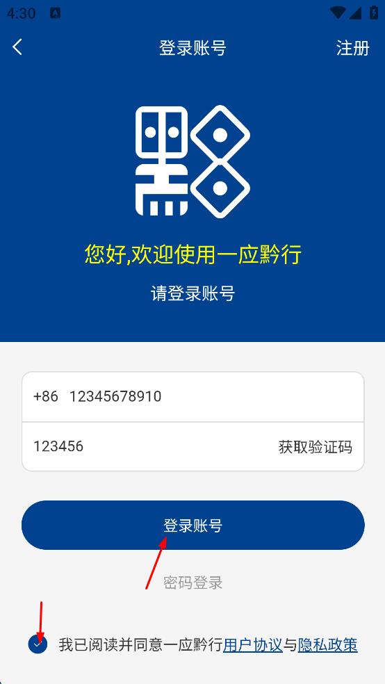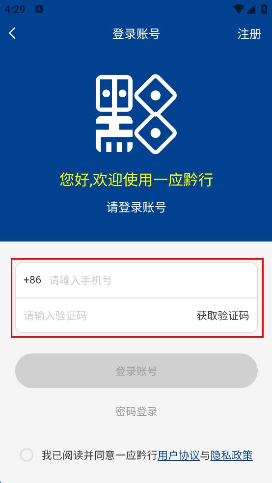 4、勾選“我已閱讀并同意一應黔行用戶協(xié)議與隱私政策”,然后點擊“登錄賬號”按鈕。