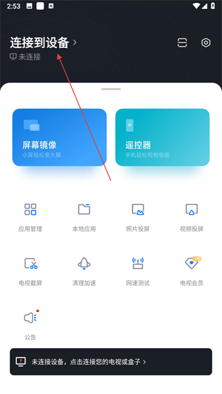 1、打開小米電視助手APP,點(diǎn)擊界面上的連接到設(shè)備選項(xiàng),進(jìn)入設(shè)備連接頁面。