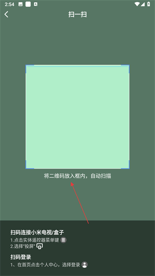 3、選擇掃碼連接,則進(jìn)入掃一掃界面,把電視屏幕上的二維碼放入掃描框內(nèi)掃描即可。