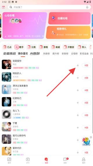 2、在唱歌的頁面中,用戶需找到+號(hào)的圖標(biāo)按鈕,點(diǎn)擊即可添加。