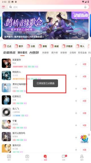 3、當(dāng)頁面中彈出:已添加至已點(diǎn)歌曲,就表示添加成功,可前往已點(diǎn)的區(qū)域進(jìn)行查看。