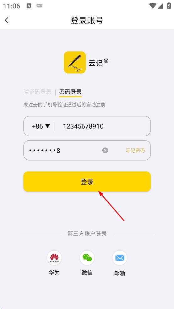 4、在密碼登錄界面,輸入手機(jī)號(hào)和密碼,確認(rèn)信息無誤后,點(diǎn)擊登錄按鈕,即可完成云記APP的登錄,之后就能使用更多功能。