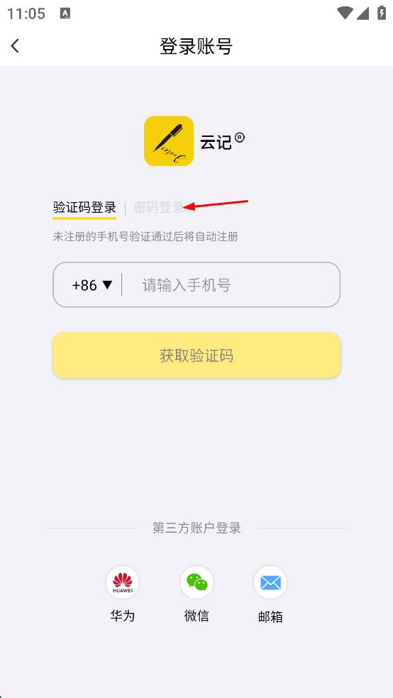 3、在登錄賬號(hào)頁面,可選擇驗(yàn)證碼登錄或密碼登錄,這里點(diǎn)擊密碼登錄選項(xiàng),準(zhǔn)備進(jìn)行密碼登錄操作。
