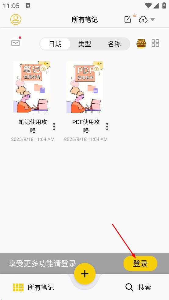 2、在所有筆記頁面,能看到筆記使用攻略和PDF使用攻略等內(nèi)容,若想享受更多功能,點(diǎn)擊頁面下方的登錄按鈕,進(jìn)入登錄賬號(hào)頁面。