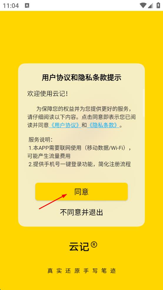 1、打開云記APP,會(huì)出現(xiàn)用戶協(xié)議和隱私條款提示頁面,仔細(xì)閱讀相關(guān)內(nèi)容后,點(diǎn)擊同意按鈕,進(jìn)入到所有筆記頁面。