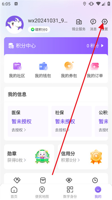 2、隨后,進(jìn)入首頁切換到【我的】,并找到右上角【設(shè)置】按鈕,如下圖所示;