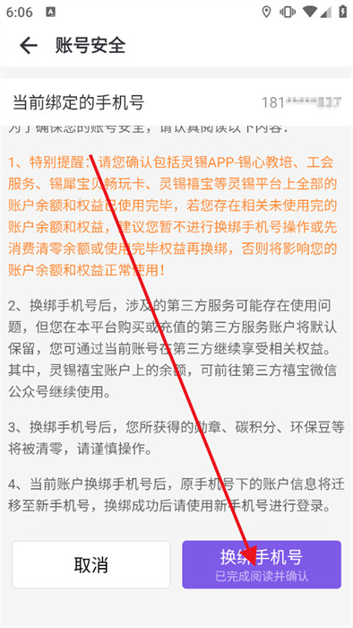 5、最后,進(jìn)入詳情頁,了解了所有解綁事項(xiàng)之后,可點(diǎn)擊右下角按鈕【解綁手機(jī)號】。