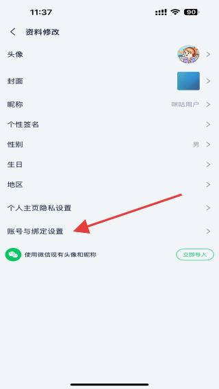 3、在資料修改界面,向下滑動(dòng)找到并點(diǎn)擊賬號(hào)與綁定設(shè)置。