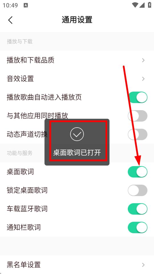 4、點擊其右側(cè)的開關(guān)按鈕,將其開啟即可在桌面顯示歌詞。