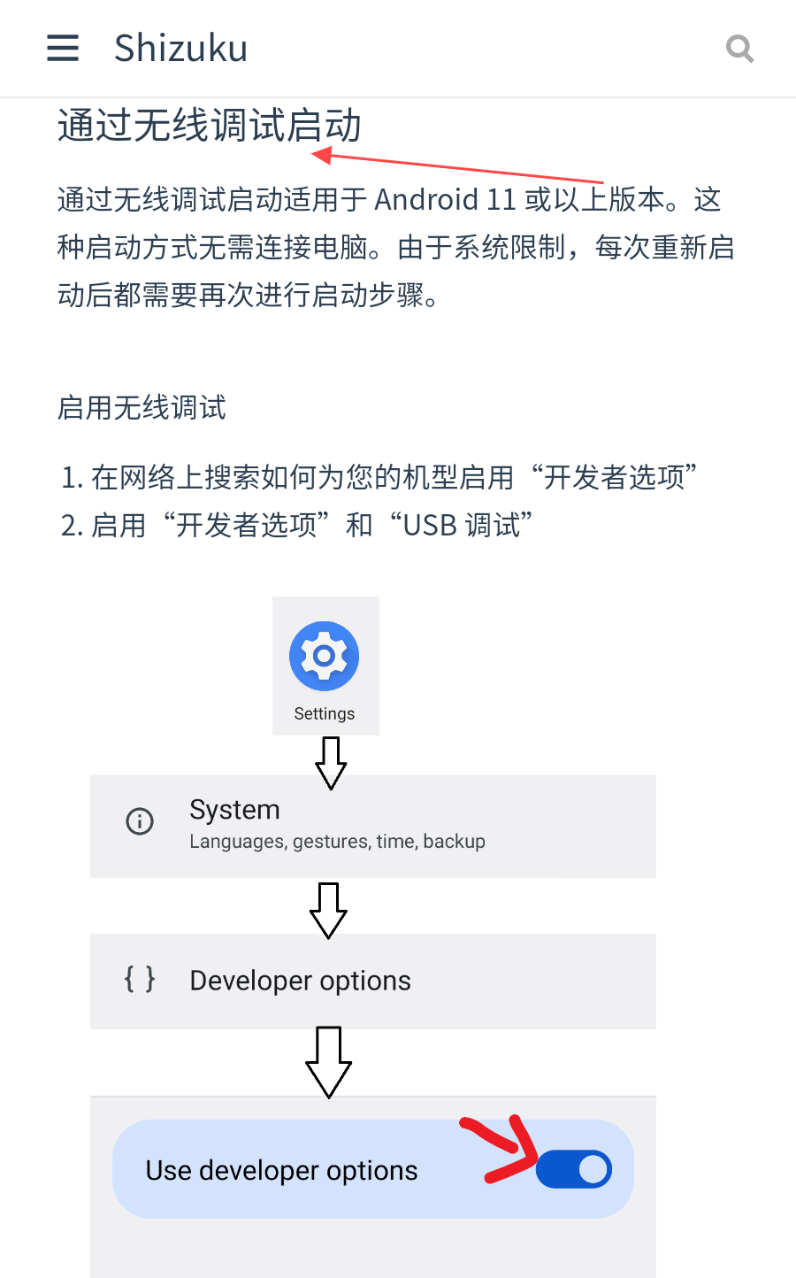 2、通過(guò)無(wú)線調(diào)試啟動(dòng)Shizuku,適用于Android 11或以上版本,無(wú)需連接電腦,先啟用開(kāi)發(fā)者選項(xiàng)和USB調(diào)試,按照提示操作,不過(guò)每次重新啟動(dòng)后都需再次進(jìn)行啟動(dòng)步驟。