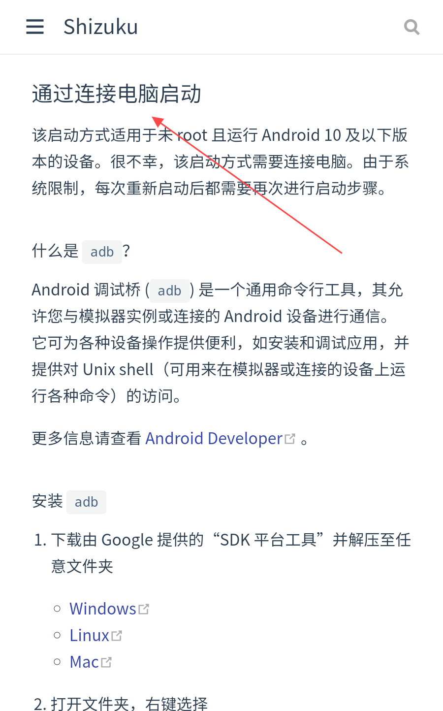 3、通過(guò)連接電腦啟動(dòng)Shizuku,適用于未root且運(yùn)行Android 10及以下版本的設(shè)備,需要連接電腦,先安裝adb,下載SDK平臺(tái)工具并解壓,再按照后續(xù)步驟操作。