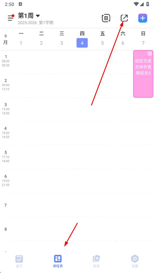 1、打開超級課程表APP,進入課程表頁面,點擊右上角如圖所示的分享圖標。