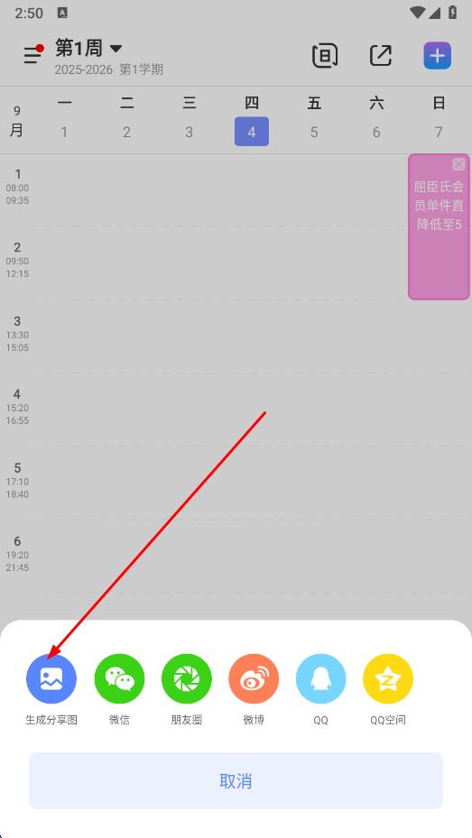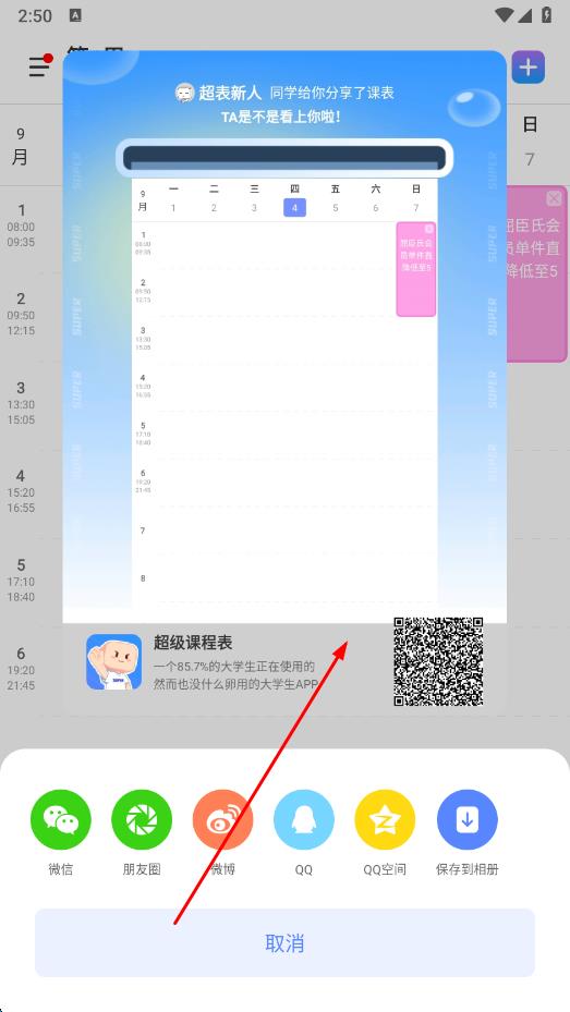 3、隨后會生成帶有課程表信息的圖片,圖片中包含二維碼,可保存或分享該圖片。