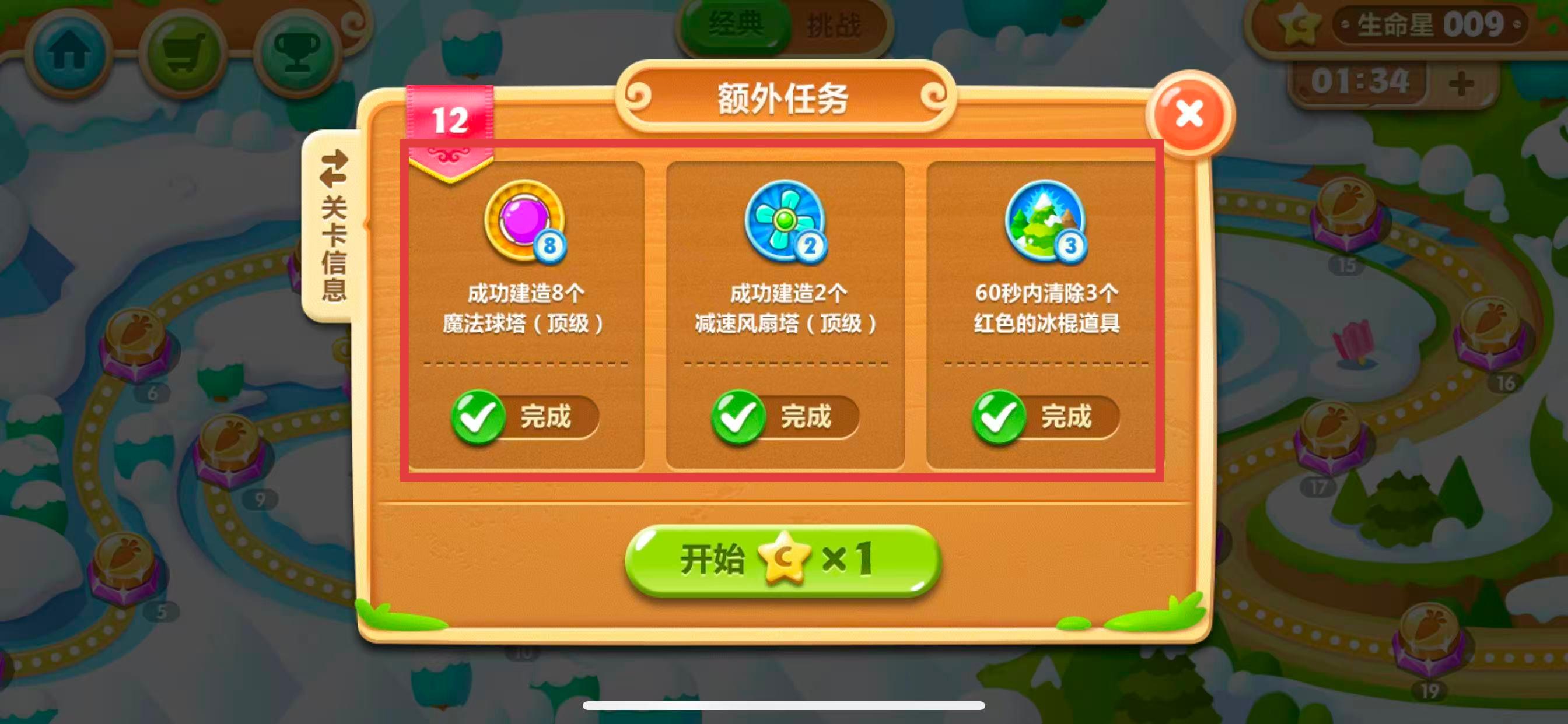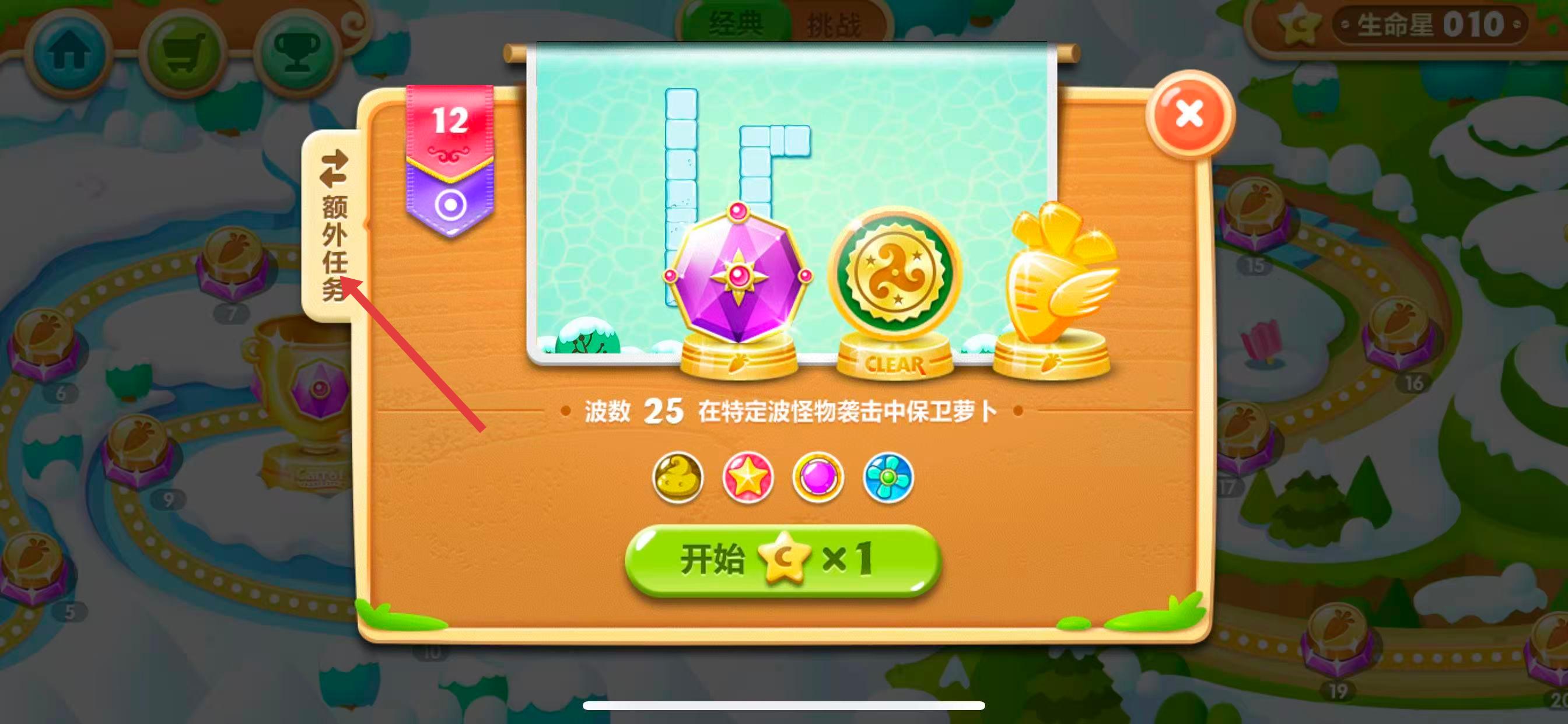 4、在彈出的額外任務(wù)界面中,即可查看該關(guān)卡的額外任務(wù)要求,如建造指定數(shù)量的特定炮塔、限時(shí)清除道具等內(nèi)容。