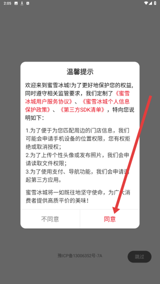 1、打開蜜雪冰城app后,在彈窗中點(diǎn)擊同意按鈕,進(jìn)入使用。