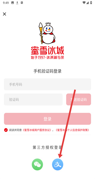 1、在蜜雪冰城登錄界面,點(diǎn)擊底部支付寶圖標(biāo),跳轉(zhuǎn)至支付寶授權(quán)頁面。