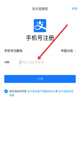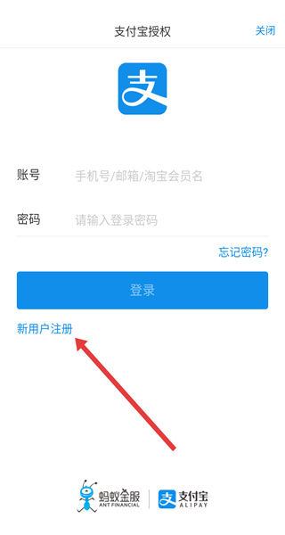 2、若需注冊(cè),在支付寶授權(quán)頁點(diǎn)擊新用戶注冊(cè),進(jìn)入手機(jī)號(hào)注冊(cè)界面。