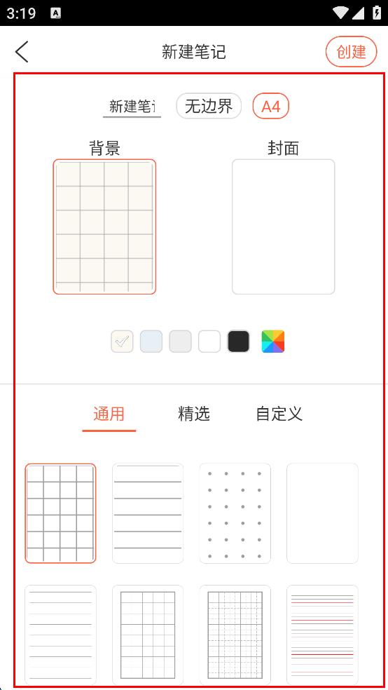 3、進入新建筆記頁面,在頁面中選擇筆記的背景、封面等樣式,也可在通用、精選、自定義選項中挑選合適的筆記模板。