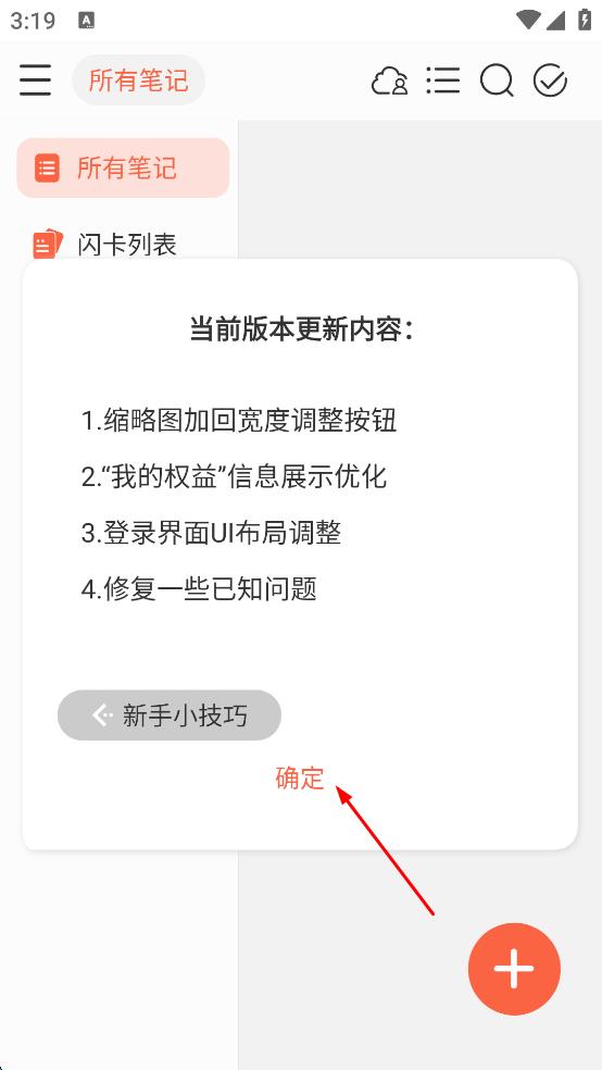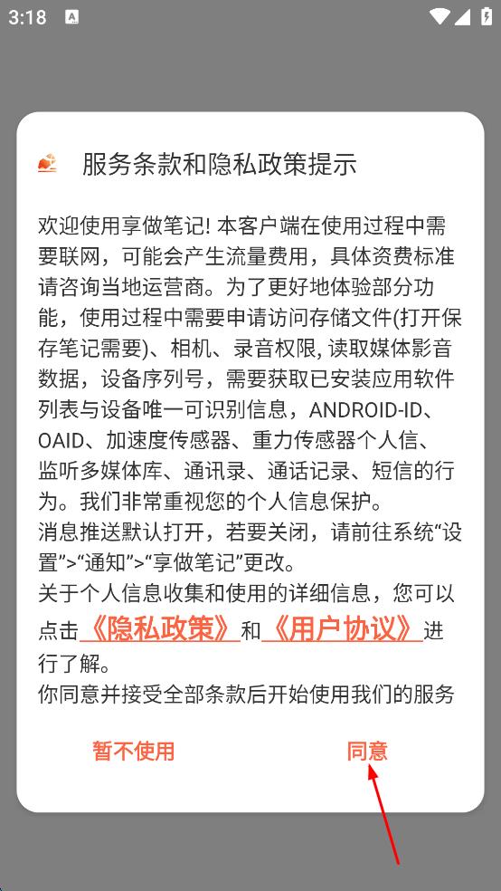 1、打開享做筆記APP,在服務(wù)條款和隱私政策提示頁面,點擊“同意”,進入版本更新內(nèi)容頁面后,點擊“確定”。