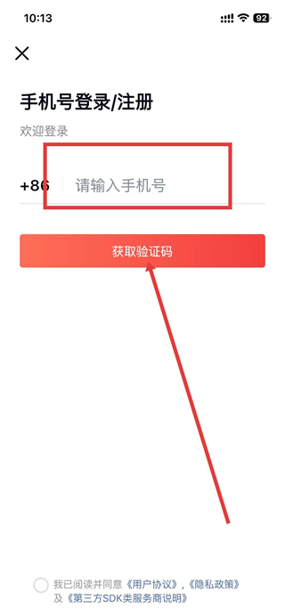 3、進入手機號登錄/注冊頁面,輸入手機號,點擊獲取驗證碼。
