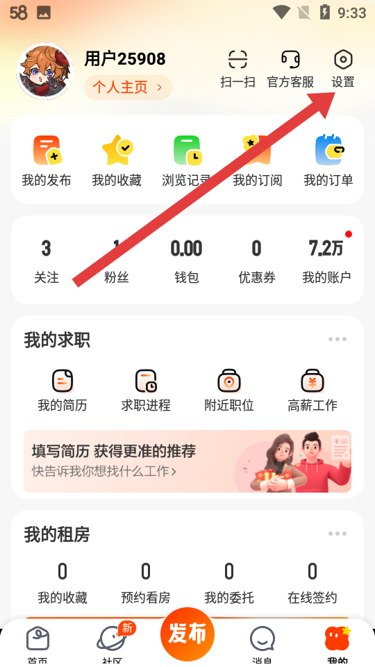 1、打開58同城APP后,點(diǎn)擊進(jìn)入我的頁面,點(diǎn)擊右上角齒輪形狀的設(shè)置圖標(biāo),進(jìn)入設(shè)置的界面。