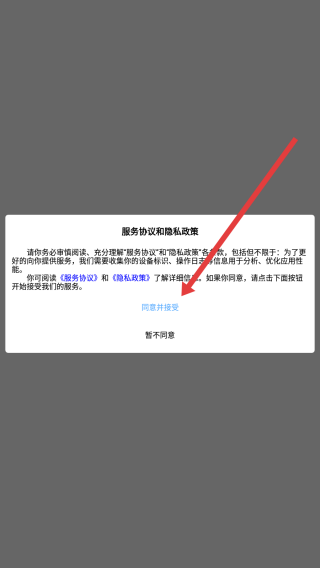 1、在服務(wù)協(xié)議和隱私政策界面,點(diǎn)擊同意并接受按鈕,方可繼續(xù)使用服務(wù)。