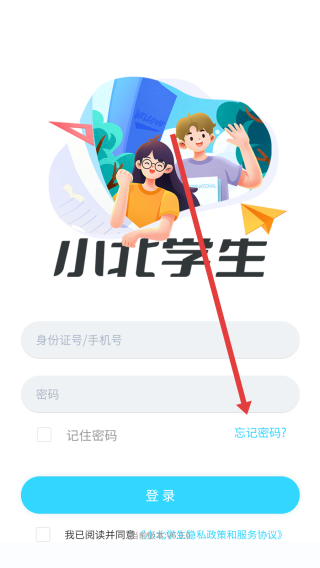 2、進(jìn)入小北學(xué)生登錄頁(yè),若忘記密碼,點(diǎn)擊忘記密碼選項(xiàng)開(kāi)始找回流程。