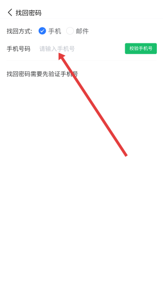 3、在找回密碼界面,選手機(jī)方式,于手機(jī)號(hào)碼欄輸入手機(jī)號(hào),再校驗(yàn)。