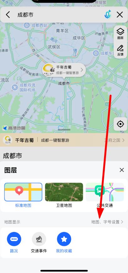 1、打開高德地圖進(jìn)入地圖界面,點(diǎn)擊右側(cè)圖層圖標(biāo),在展開菜單中點(diǎn)擊地圖、字號設(shè)置選項(xiàng)。