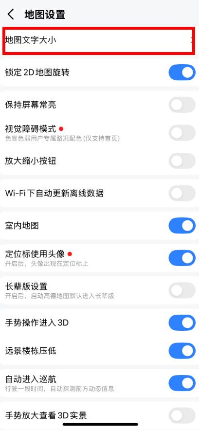 2、進(jìn)入地圖設(shè)置頁面后,點(diǎn)擊地圖文字大小選項(xiàng)。