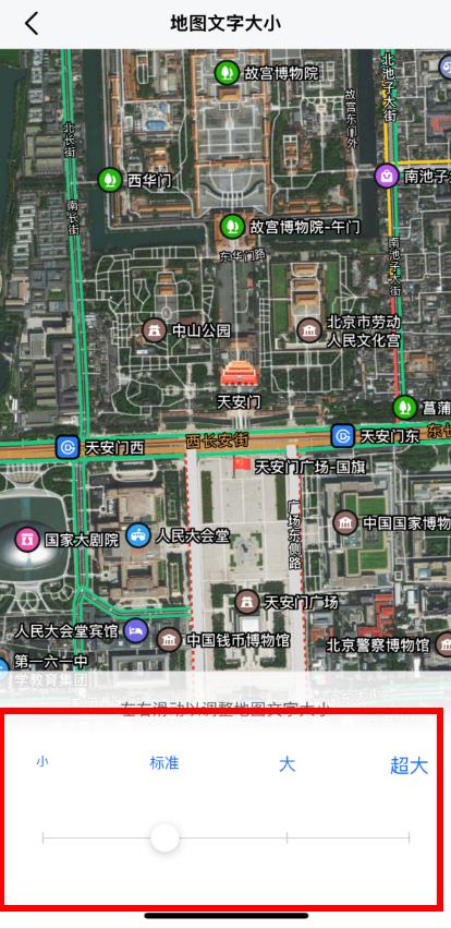 3、在地圖文字大小設(shè)置頁面,可選擇小,標(biāo)準(zhǔn),大,超大,或拖動滑塊自定義設(shè)置地圖文字大小。