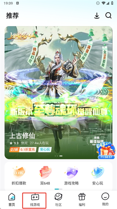 1、進(jìn)入軟件的首頁能看到平臺(tái)推薦的一些熱門游戲,我們還可以去找游戲這里找尋更多的作品;