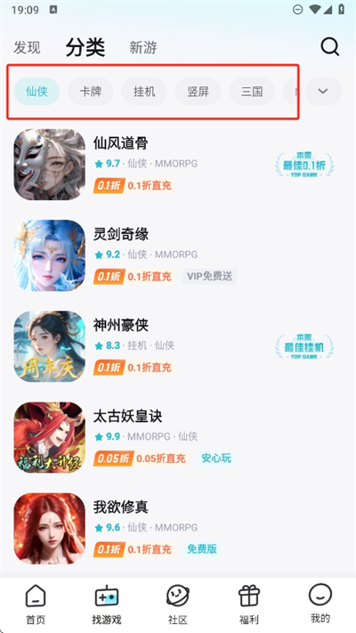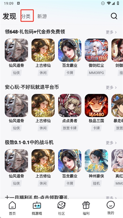 2、進(jìn)入發(fā)現(xiàn)頁面找尋游戲時(shí),可以選擇分類查看更多的游戲并進(jìn)行了解和下載非常簡(jiǎn)單;
