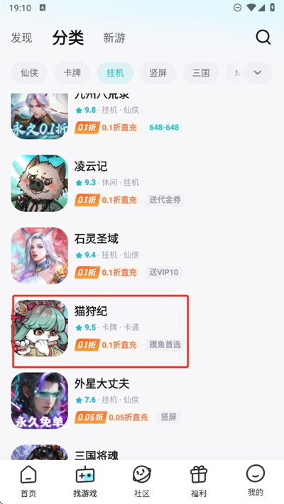 4、比如我們想要看看掛機(jī)玩法下的游戲,我們以貓狩紀(jì)這個(gè)游戲?yàn)橹鼽c(diǎn)擊查看更詳細(xì)的內(nèi)容;