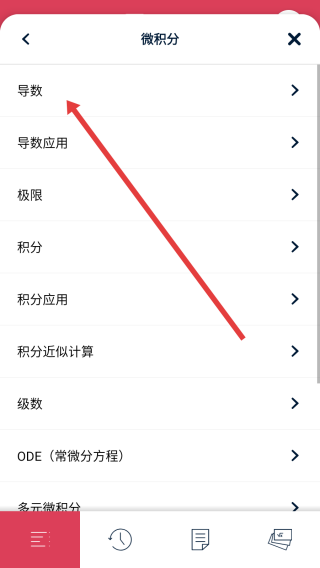 3、在進(jìn)入到微積分頁面中,可以點擊導(dǎo)數(shù)選項,進(jìn)入查看。