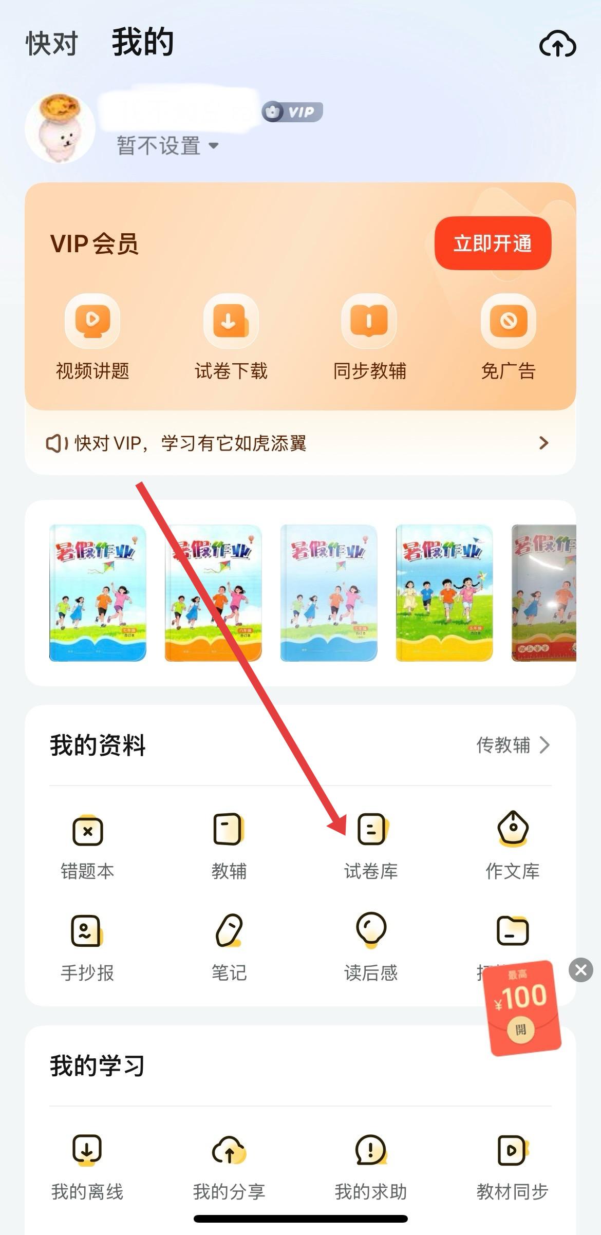 1、進入快對作業(yè)app,點擊進入我的頁面,找到我的資料區(qū)域里的試卷庫,點擊進入。
