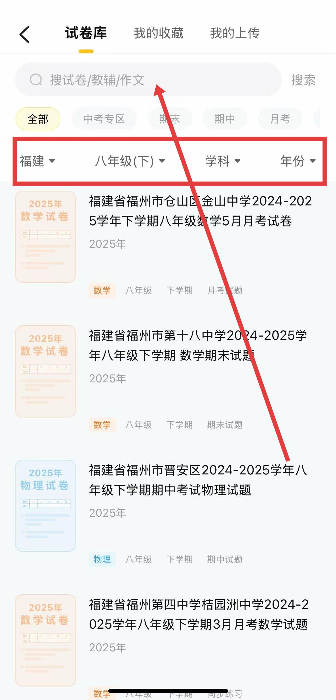 2、在試卷庫通過篩選省份、年級、學(xué)科和年份,或通過關(guān)鍵詞搜索,找到對應(yīng)試卷。