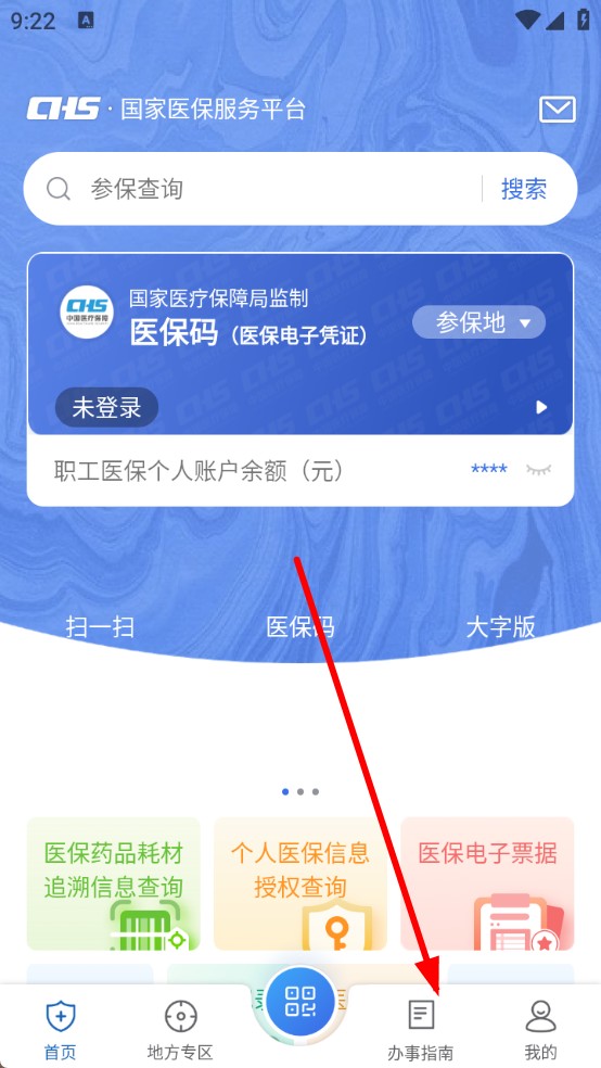 1、打開國家醫(yī)保服務(wù)平臺APP,點擊頁面底部導(dǎo)航欄的「辦事指南」,進入辦事指引界面。