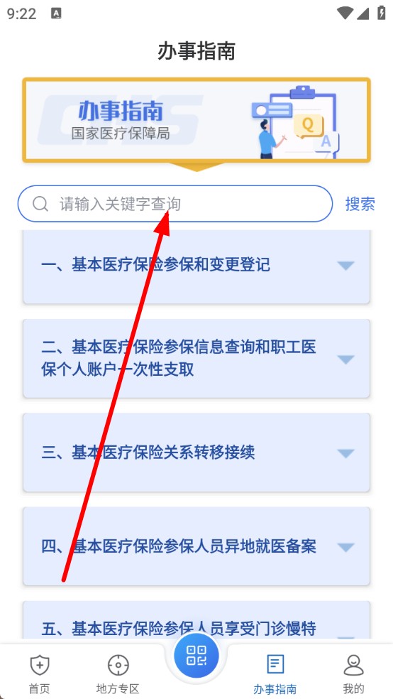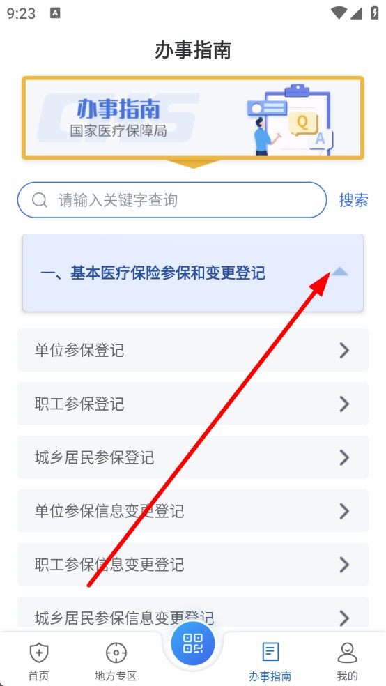 2、在辦事指南頁面,可通過頂部搜索框輸入關(guān)鍵詞查詢,或選擇「基本醫(yī)療保險參保和變更登記」等分類模塊。