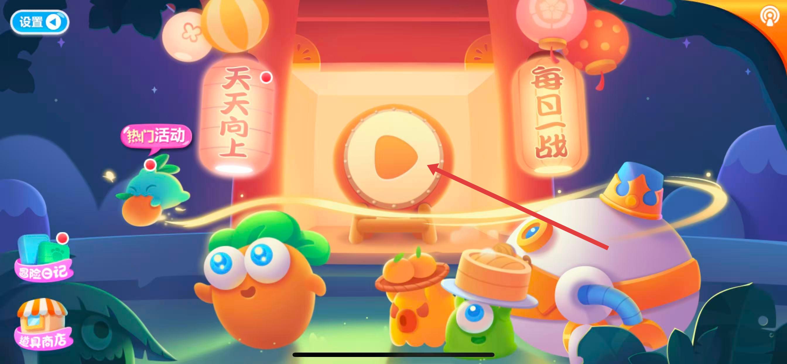 1、在游戲主界面,按紅箭頭指向,點(diǎn)擊中間大鼓樣式的播放按鈕,進(jìn)入關(guān)卡地圖選擇頁(yè)。